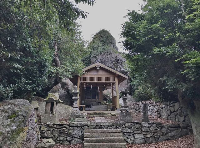 その「巨岩」とは、島では「厄神様(やくじんさま)」と呼ばれ、上の画像のように「厄神社」の拝殿の裏手に屹立する高さ約8mの大岩を中心とする巨石群のことだ。