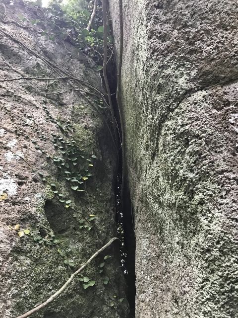 この巨石群は山頂近くにあるのだが、その背後にも回り込める道があり、上の画像は並立する二つの巨岩の裏側から、下方に向かって切り揃えたかのように開いた岩根より、上方に向かって撮影したものである。