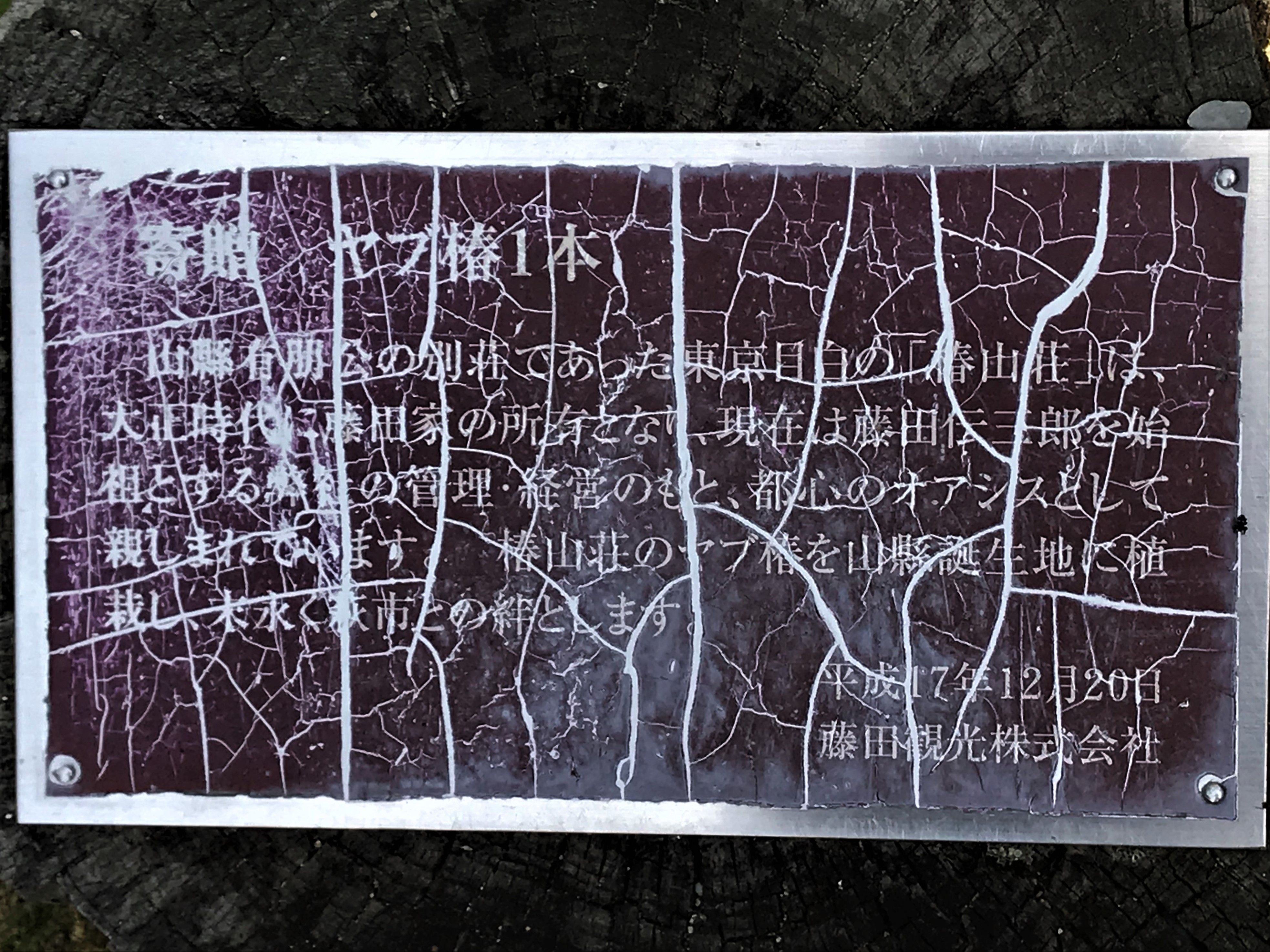 ちなみに、下の画像の解説版に書かれた東京の「椿山荘」から移植された「寄贈 ヤブ椿1本」とは、冒頭画像に映る看板の左奥に見える樹木である。