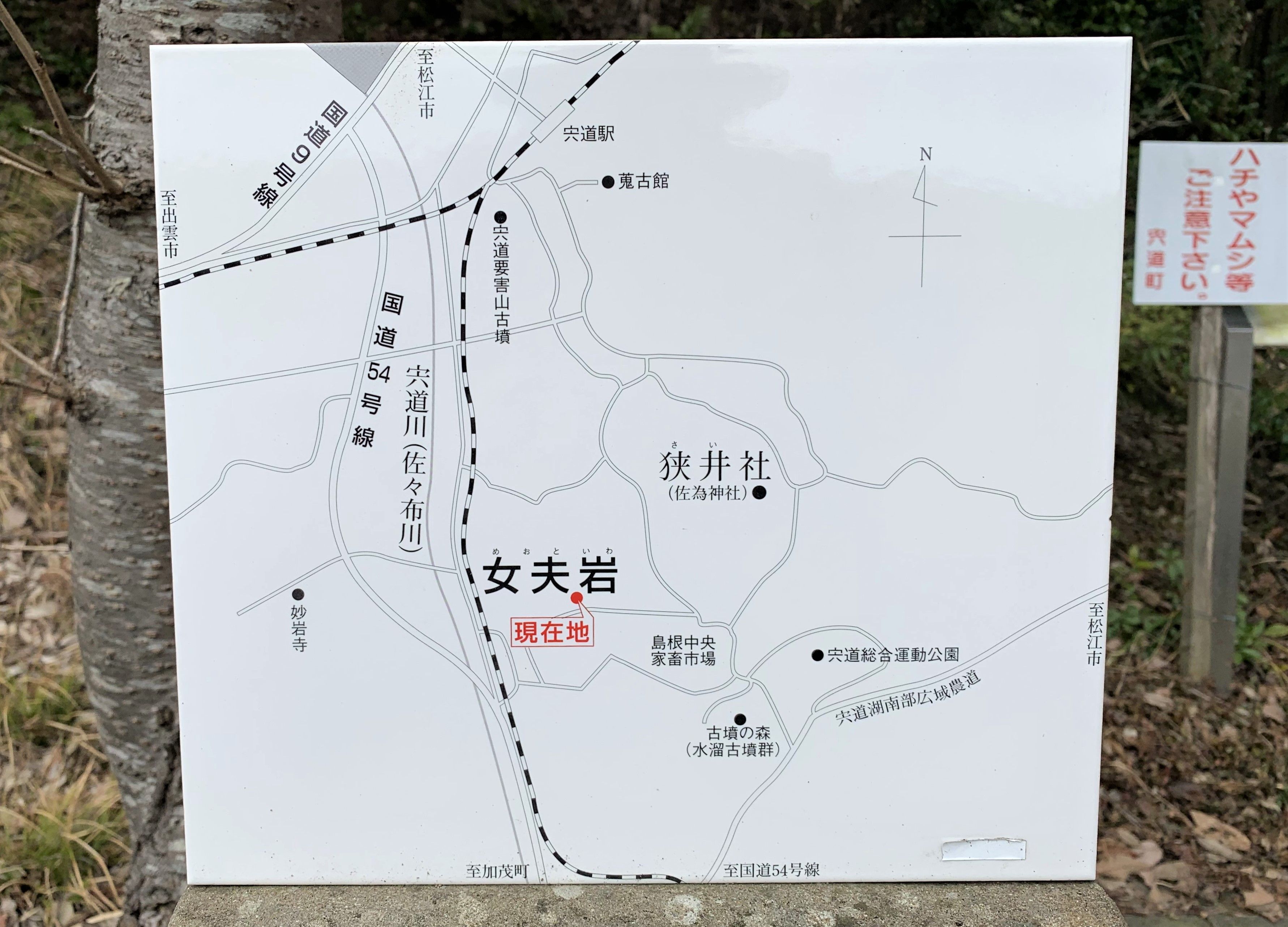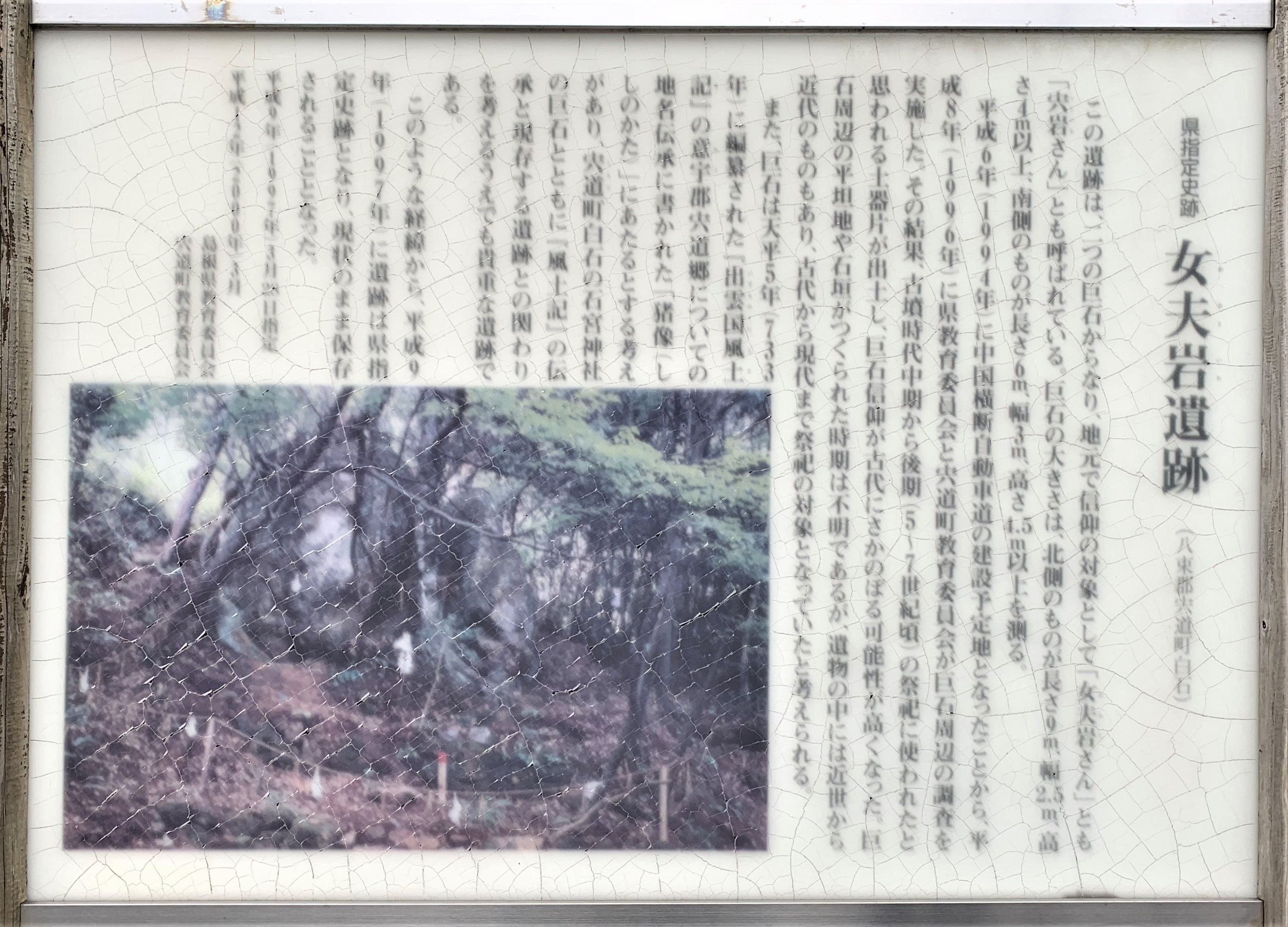 この現在は「女夫岩遺跡」と称される二つの巨石(上の画像)からなる磐座は、古くから「女夫岩(めおといわ)」または「宍岩(ししいわ)」とも呼ばれ、近くにある「シジミ」で有名な汽水湖の「宍道湖」の名称「宍道(しんじ)」は、この岩神の名前にちなんでいるということだ。