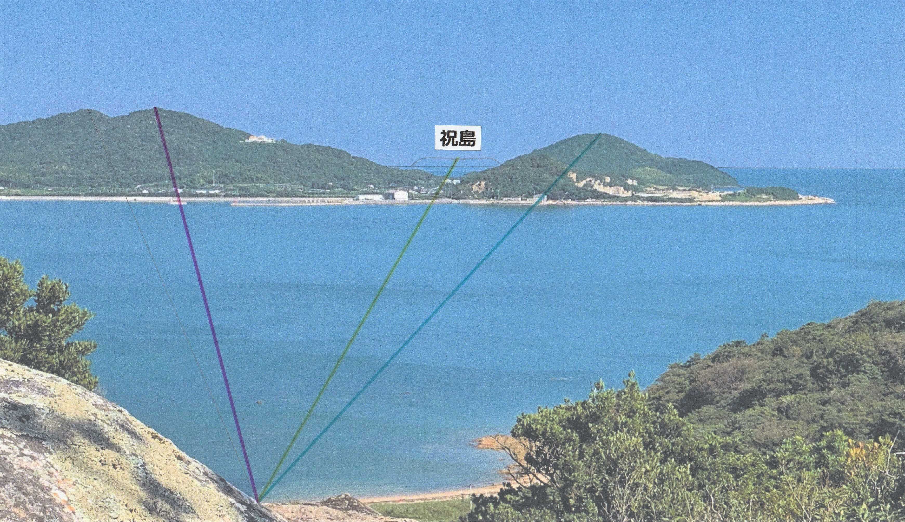 すると、やはりその反射光(上の画像の黄色の線が示す)が向かう先は、かの「祝島」だと体感した。