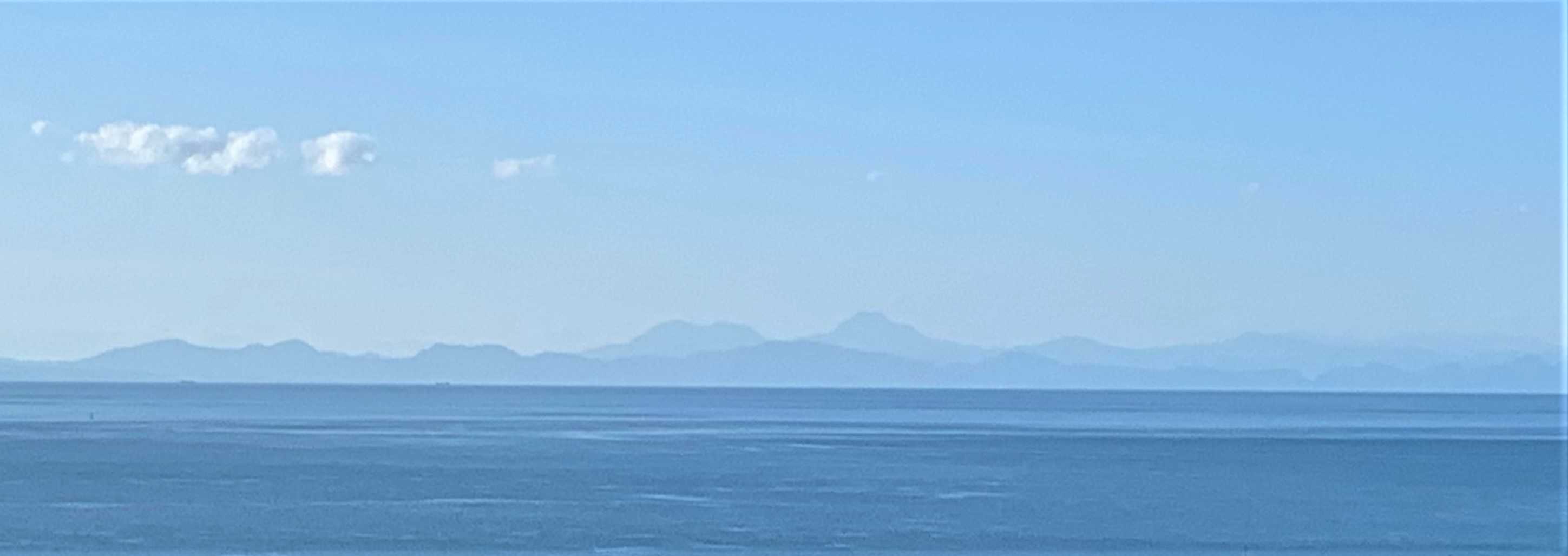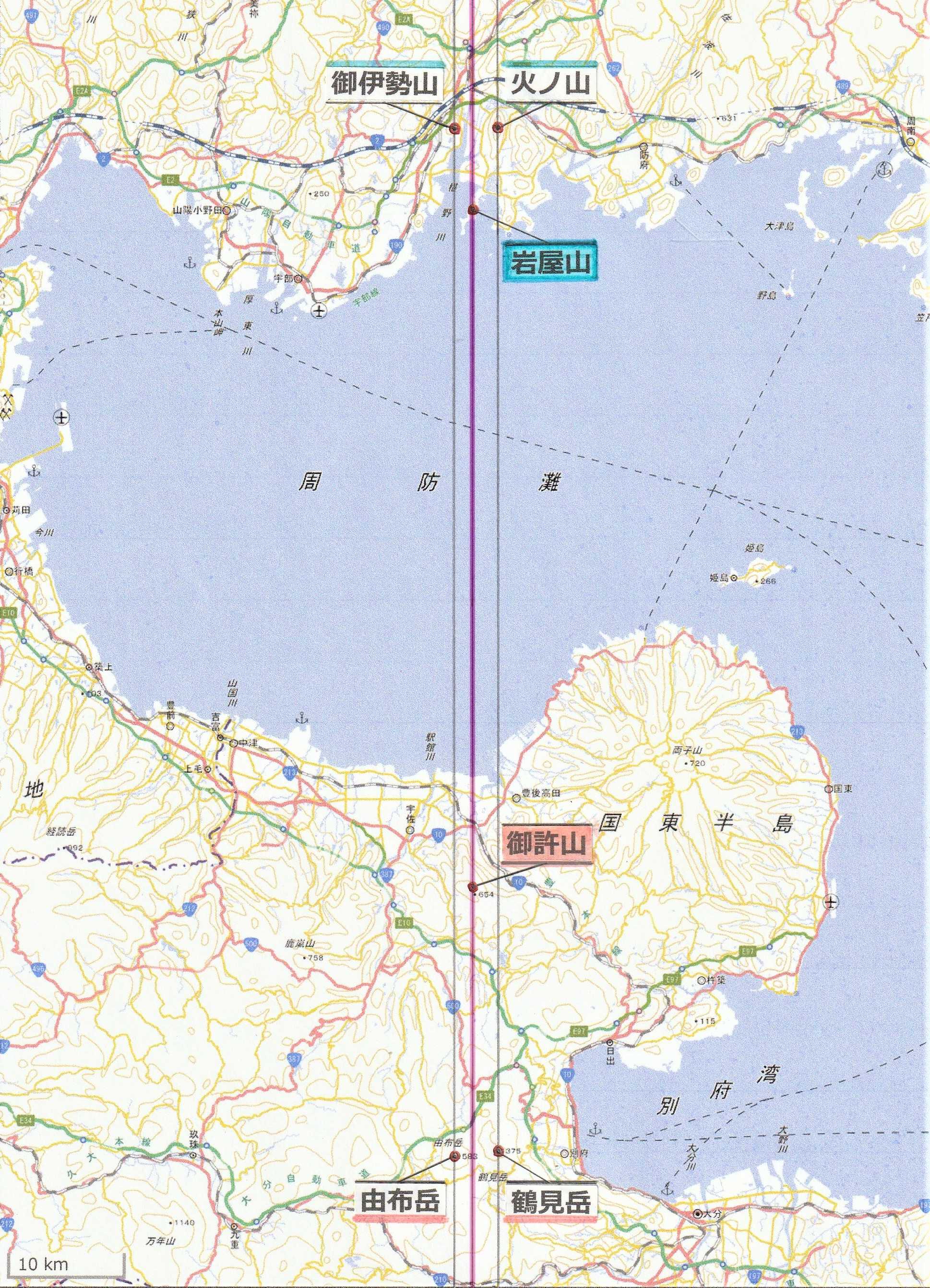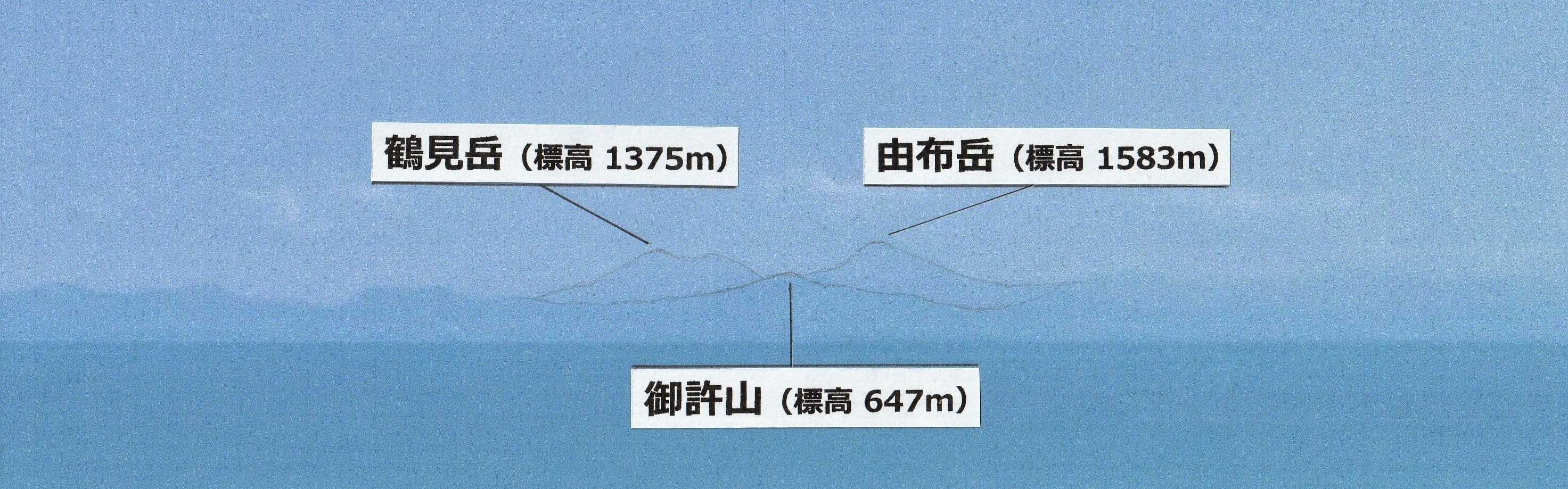 さて、このシリーズでは何度も取り上げた岩屋山より瀬戸内海を挟み、九州方面の遠方に望むことのできる南方の三山が、「由布岳(ゆふだけ)」と「鶴見岳(つるみだけ)」、そしてその前方に色濃く見えるなだらかな山並みの頂が、豊前国一宮 宇佐神宮の神体山である「御許山(おもとさん)」である。