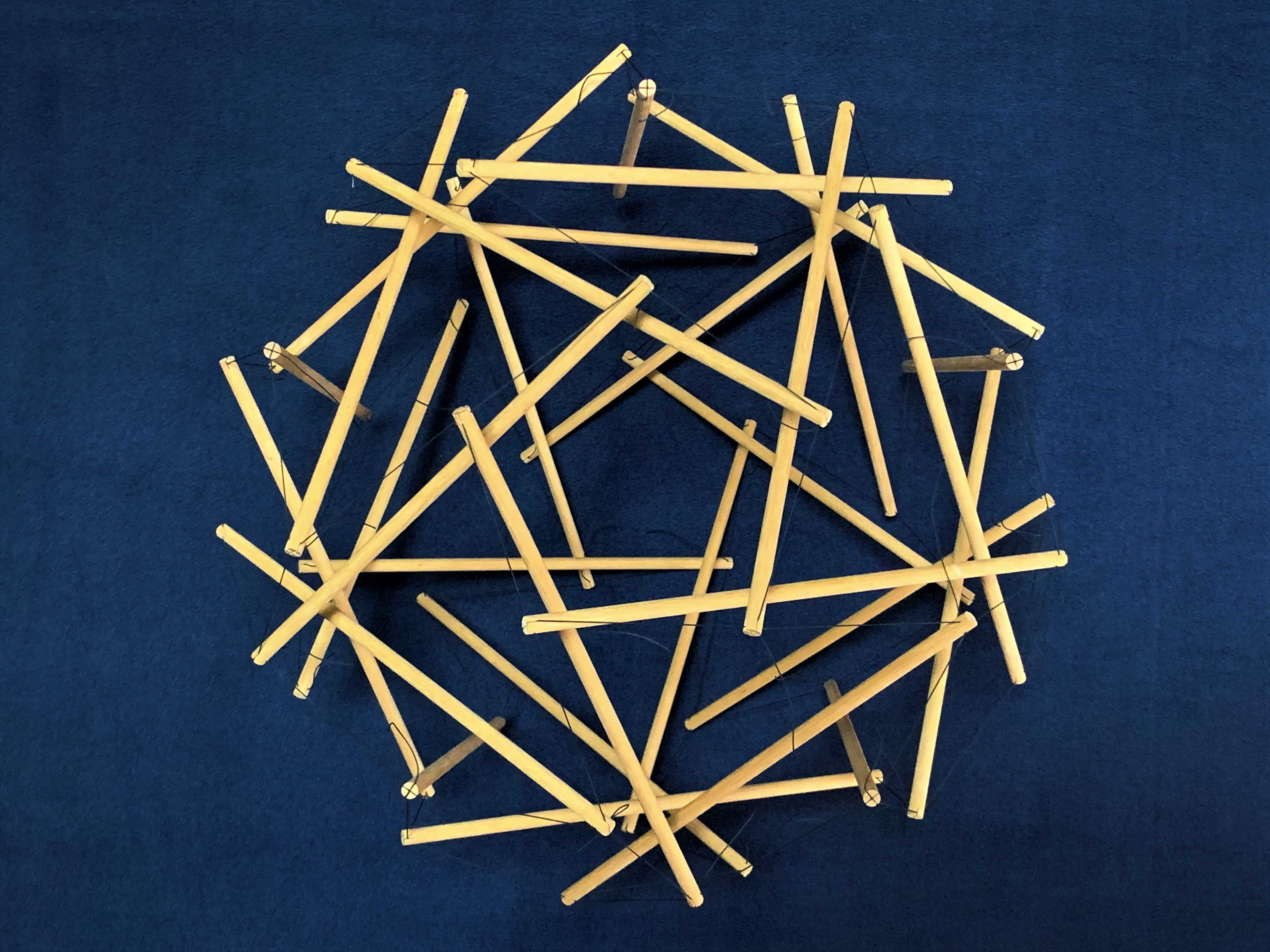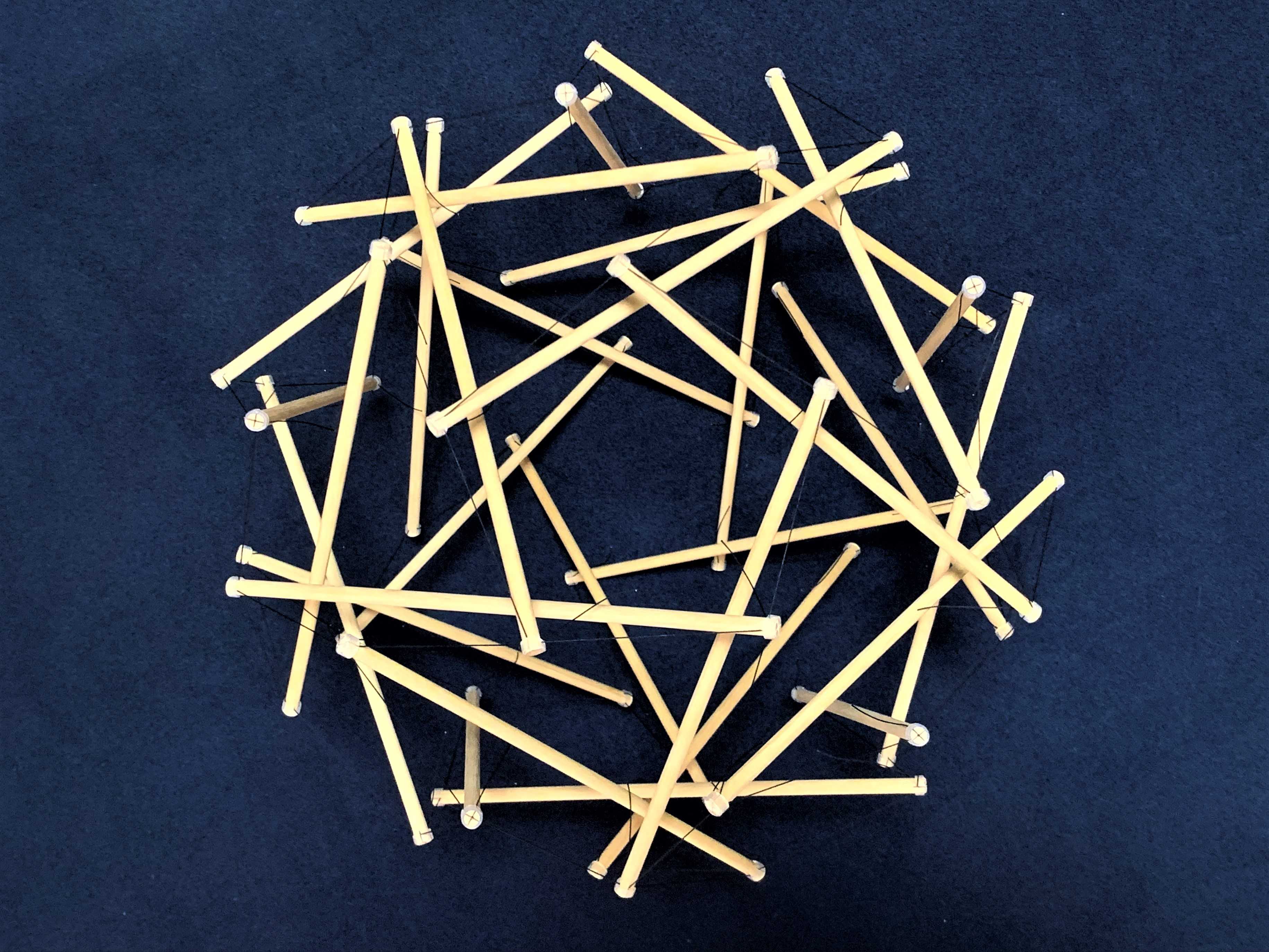 (※)テンセグリティーとは…非連続な圧縮材を連続した張力ネットワークにより統合した超軽量構造体のこと。ちなみに今回のワークショップで使用した材料は、「圧縮材」として計30本の”丸棒(約22cm)”と「張力材」として計30本の”強力な炭素繊維”であった。