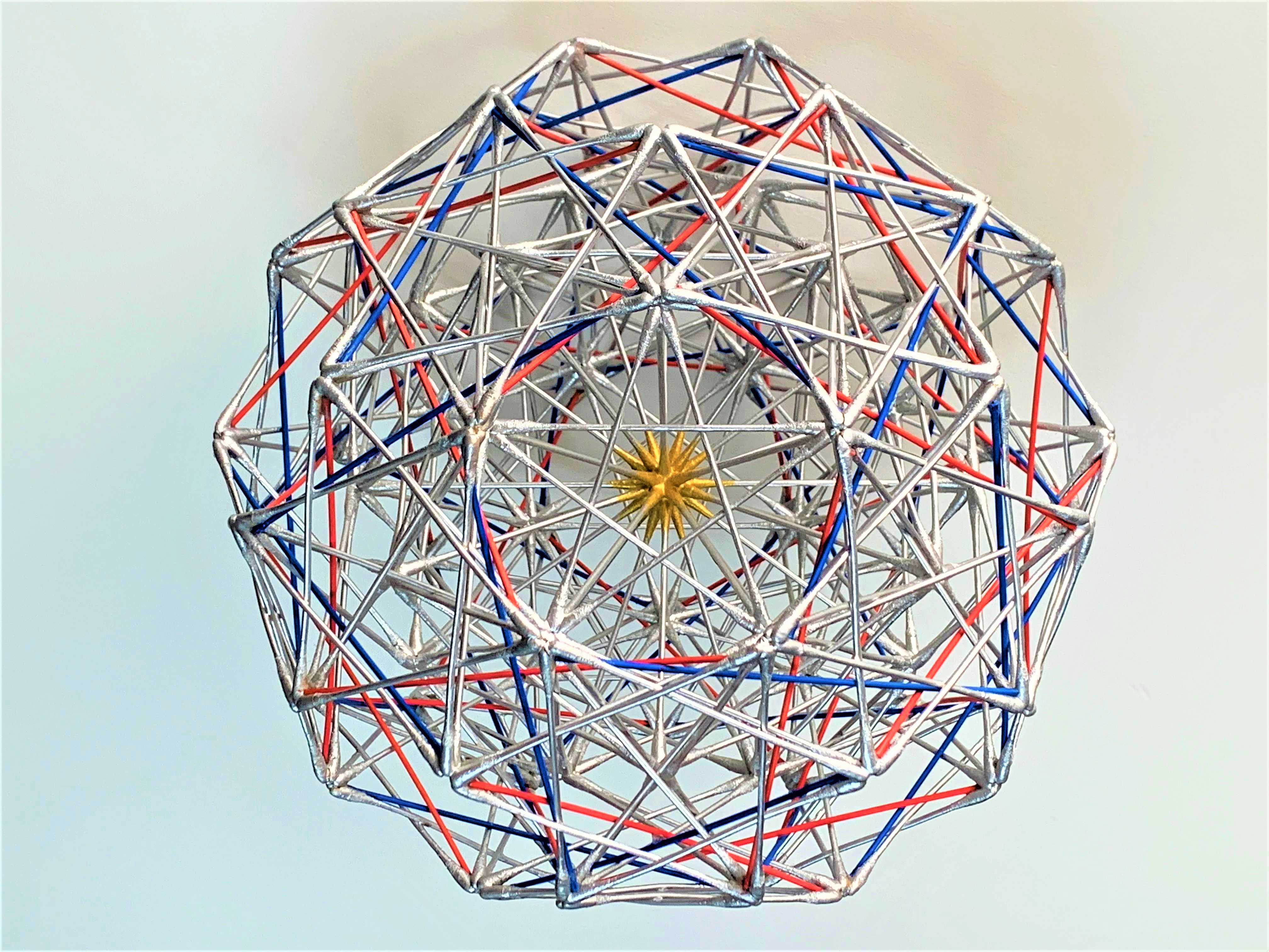 この「新作の造形」の全体像を簡単に解説すると、上掲画像の冒頭と末尾の二種類の「新作の造形」と"右まわり"と"左まわり"の二種類の「テンセグリティー」は、共に五角形状の窓(空間)を正面にして撮影したもので、「新作の造形」として”右まわり”のテンセグリティーの「圧縮材」30本の〈見立て(素材は竹ヒゴ)〉を「青色」に着色し、”左まわり”のテンセグリティーの「圧縮材」30本の〈見立て〉を「赤色」に着色して、計60本を銀色の「フラーレン構造」に配置したものとなる。