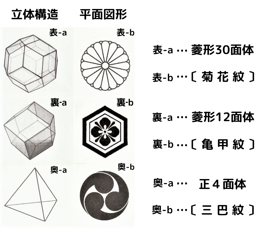 それは以下の関連記事に書いたように、この大きく”三層構造”から成る複合立体では表層の「表…第三層」となる「菱形30面体」(上の画像では”暖色系”)が、〔伊勢神宮〕の御神紋である「菊花紋(十六葉八重表菊)」に、そして「裏…第二層」となる「菱形12面体」(上の画像では”寒色系”)が、〔出雲大社〕の御神紋である「亀甲紋(二重亀甲剣花菱)」に、それぞれ私の脳裏に強く焼き付いたからである。