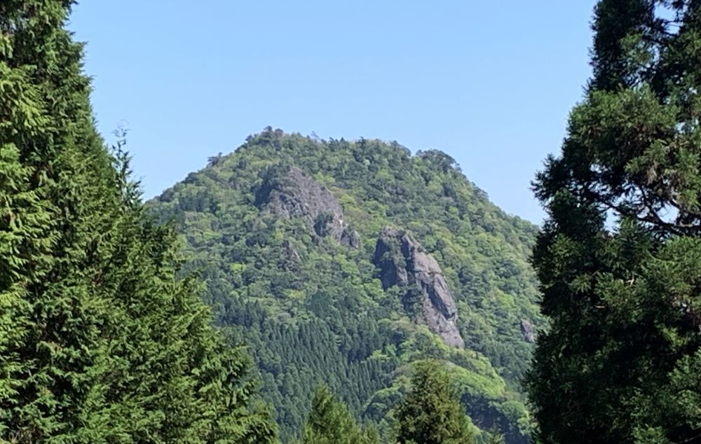 車を停めた駐車場に向かって最後の坂道を歩きつつフト上を見遣ると、下の画像のように前方の山の中腹に当地域の《耶馬渓》に特有の、まるで「山水画」のように屹立する岩塊が眼前に現れたのであった。
