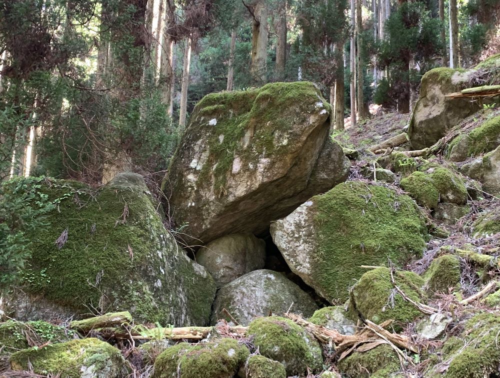 次に上の画像は、さらに山道を下ったところにある見事な石組みの「磐座群」を撮影したものだ。
