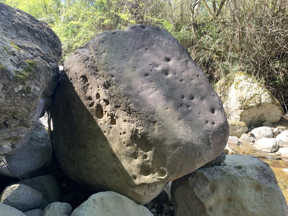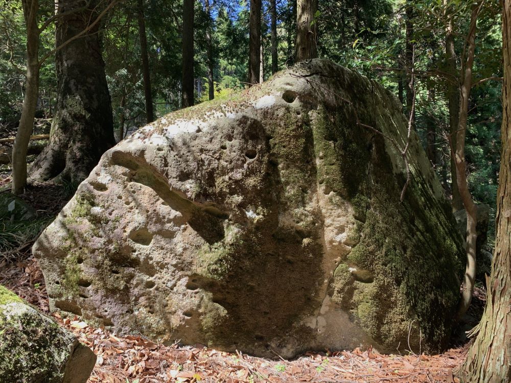 まず上の画像に映る「盃状穴」の施された岩は、山道が分岐する場所に”道しるべ”のように置かれており、その側面や裏面にも多くの穴が穿たれており、神聖な雰囲気を漂わせていた。