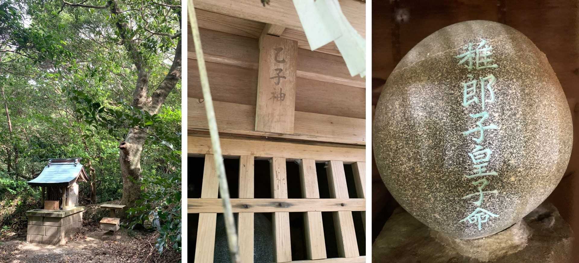 」を祀る小社を少し遠くから撮影したものが左側、当社の「乙子神社」と記された社額を中心に撮影したものが中央、そして社内に鎮座する「