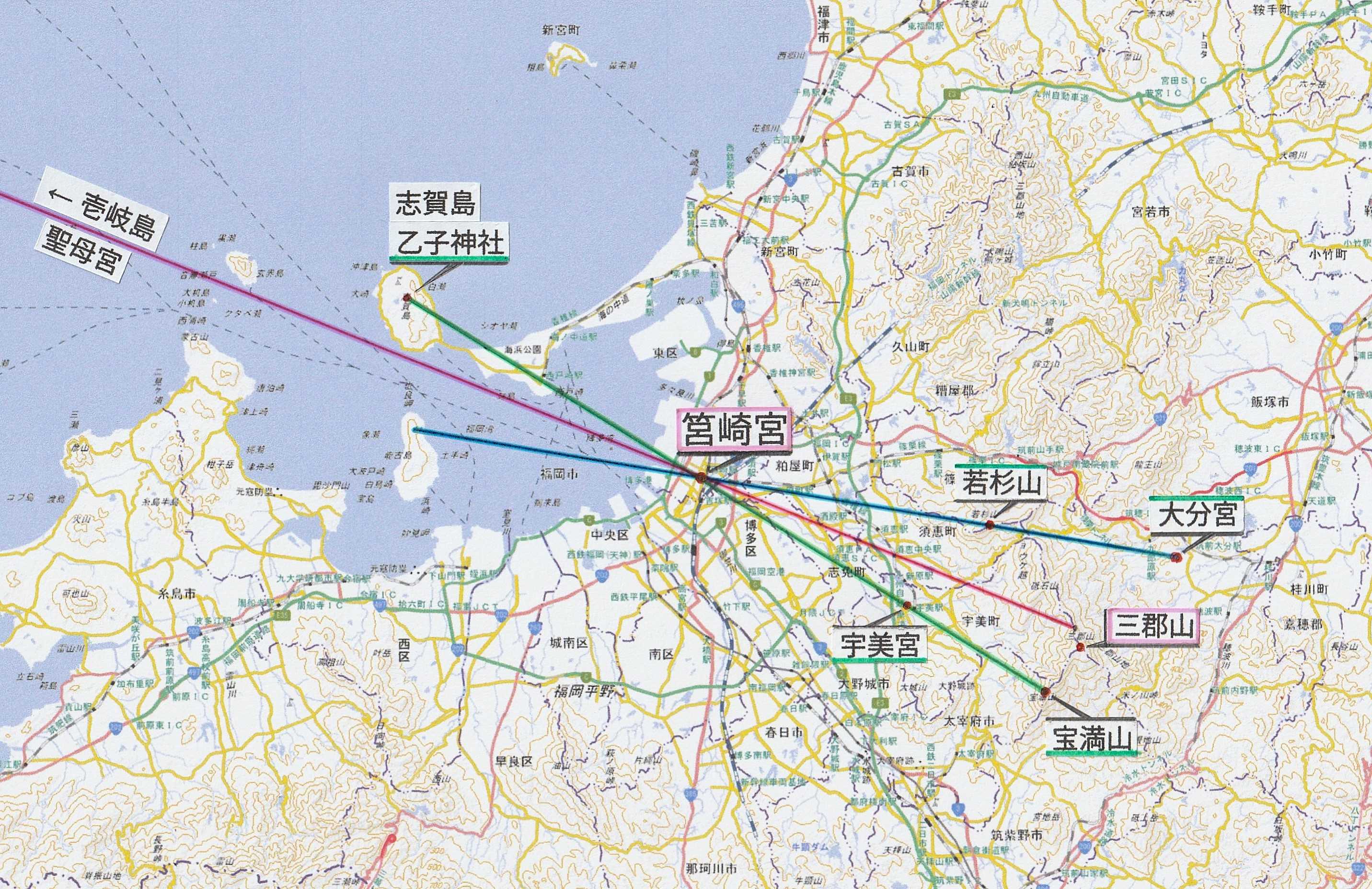 で解説済みだが、その軸線とは「冬至」の”日の出”方位を重視した「筥崎宮」ー「宇美宮」ー「宝満山」を結ぶ《三点一直線》の祭祀線であった。