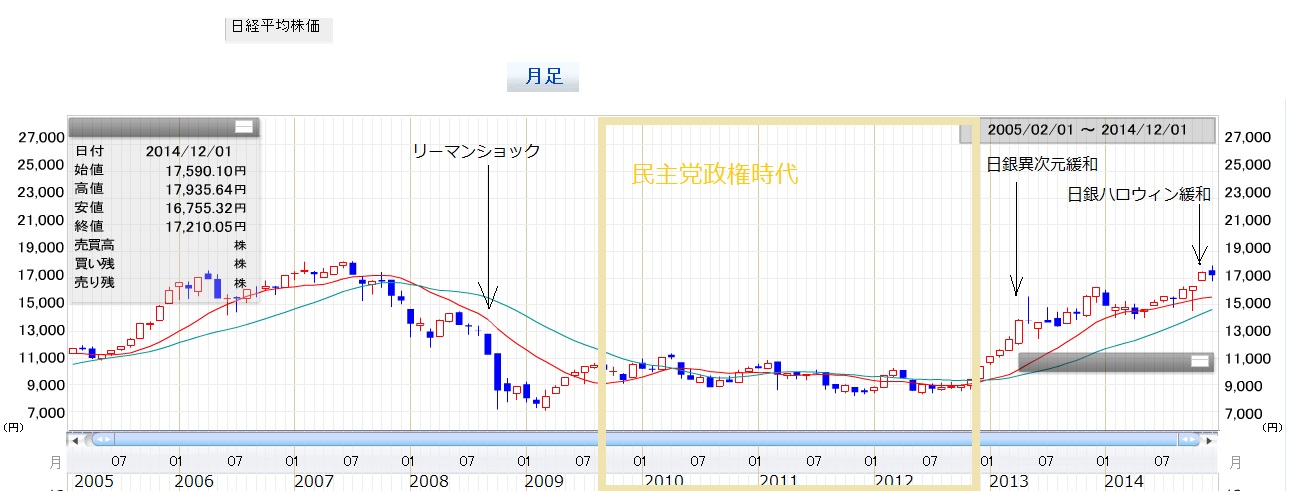 黒田日銀緩和・異次元緩和2013.04. マネタリーベースを12年末に140兆円弱だったのを、13年末に200兆円、14年末には270兆円にする。 向こう2年程度で物価上昇率2%にする。 マネタリーベース(資金供給量)を2年で2倍にする。(138兆円を270兆円に) 国債の買い入れ年間50兆円増加。(13年は20兆円増加) 国債平均残存期間は従来1~3年だったものを7年に。 保有額、平均残存期間とも2年間で2倍以上にする。 ETFを年間1兆円増加させる(13年は0.5兆円程度) J-REITを年間300億円増加させる(13年は100億円増加)マネタリーベースは2014年10月末時点で260兆円。・ハロウィン緩和2014.10.31 マネタリーベースを、2014年末275兆円の目標だったのが、15年末に355兆円にする目標に換えられた。1.長期国債の保有残高が年間80兆円に相当するペースで増加するように、30兆円増しで買い入れる。 2.買い入れ国債の平均残存期間を7年から10年程度に3年程度延長させる。3.ETF(上場投資信託)を年間3兆円、J‐REIT(上場不動産投資信託)を年間900億円のペースで増えるようにと、それぞれ保有残高を3倍増にする。このハロウィン緩和の影響で、同日の市場は大きく反応し、日経平均株価は暴騰し、7年ぶりの高値を更新。週明けの11月4日には1万7000円台を突破。円は緩和前の1ドル=109円から114円へ急落。2015年3月下旬時点でマネタリーベースは283兆円にまでなっている。ちょうどスタート時点といえる12年末の140兆円弱の倍にまでなっている。