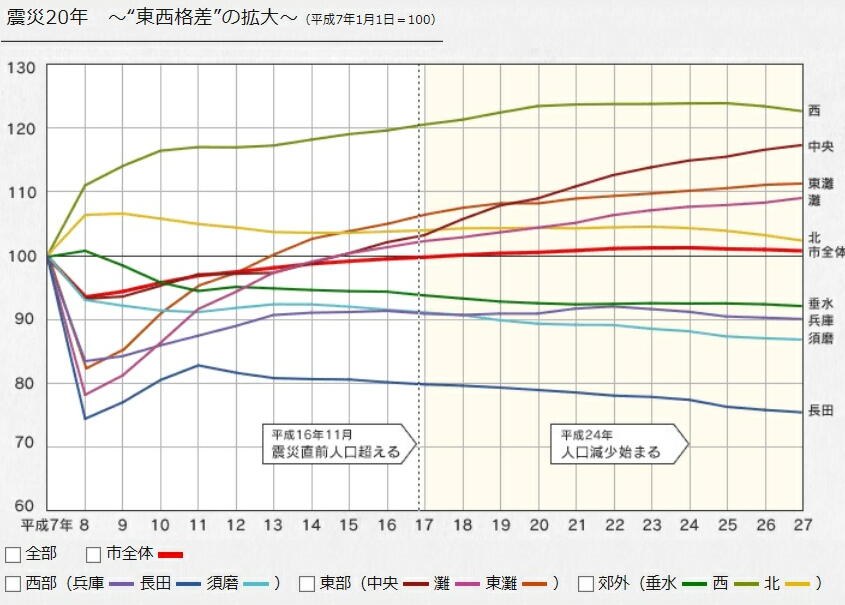 ・東側の長田、兵庫、須磨、垂水の人口が現象する一方、西側の大阪に近いほうの中央、東灘、灘は人口が増えた。郊外の西区と北区も増えている。 これが何を意味するかというと、まず大阪に近いもともと開けて神戸のいいイメージのあったところは復興したが、下町で高齢化がすすみ、もともと遅れていて、新しい町づくりの担い手のいないところは人口が流出しているということではないだろうか。特に長田区は人口が4分の3に減った。