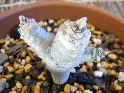 以前から欲しいと思いつつなかなか出会うチャンスのなかったパキポディウム・エブルネウムPachypodium cf eburneumまだまだ小さいけどネットで好みの株を発見~!(嬉)横から見てもぷっくり感 がサイコ~ッと、ホクホクだったのだが、アレヨアレヨの間に立派だったトゲトゲ部分(↓)がへにゃって(?)きて、、、2週間の里帰りから帰ってみると見るも無惨な姿に、、、(↑)悲しみで写真ブレてます。ドヨ~ン(暗)。留守中、こっちは連日豪雨だった模様。家の中に入れておくべきだったのか?あ”うぅ。ココ↓ ぽちんっ応援ありがとう!パキポディウム ブレビカウレ【送料無料】◇観葉植物◇多肉植物◇パキポジューム 恵美須笑い 3寸◇観葉植物◇多肉植物◇パキポジューム 恵美大黒 3寸