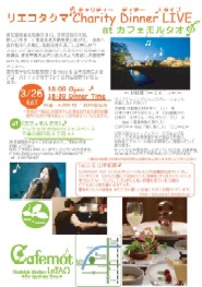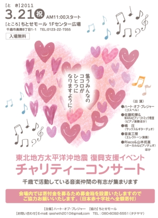 とても可愛いフライヤーが届きました3月21日11時~ちとせモールセンター広場にてチャリティーライブをします約12組のアーティストが参加すると聞いています今の私に出来ることですニュースで目にする映像は想像し難いものです「信じなければやりきれない。。」そう涙ながらに語る被災者の言葉が胸に響きます暖かい場所にいることやご飯もちゃんと食べれることが申し訳ない気持ちになるけど被災者の方のためにも、いつでも助けられる状態でいることも今の私たちが出来ることのような気がします涙はでるけど役に立てることを何かしたい3月21日足を運んでくだされば嬉しいです