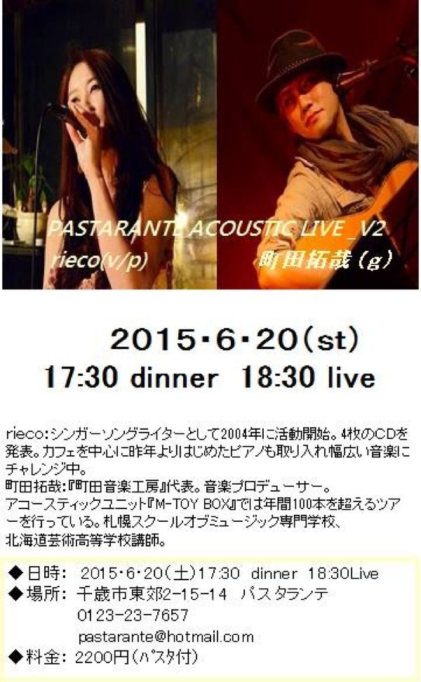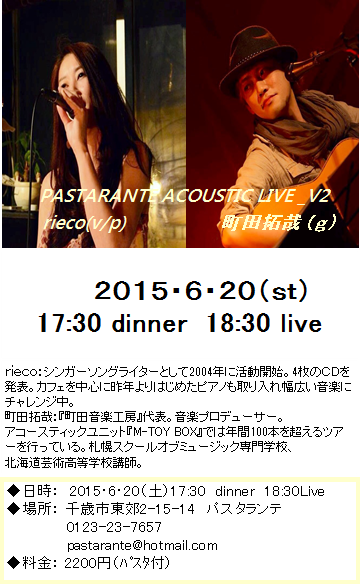 6月20日マッチーさんとパスタランテライブをします! あっという間に過ぎる毎日の中で 自分が一番好きなこと、やらなければならないことを 積み重ねたいと思っています。 何年かたったときに「もっと頑張れた」と思わないように 仕事も音楽もできることを精一杯やり その連続が必ず未来の自分に繋がると信じています 心を込めて演奏すること以外にはなく あとは聴いてくれた方が受け取ることで私の手から離れることです こうして一緒に音楽を作れる人に出会えたことは本当に感謝すべきことです マッチーさん、パスタランテの程島夫妻心から感謝します 貴重な時間を使って来てくださったお客様が「来てよかった!」 っと思っていただけるよう心を込めます。 よろしくお願いいたします^^ もし、このブログを見て来てくださった方がいれば『ブログみて来たよ!』と声をかけてください。