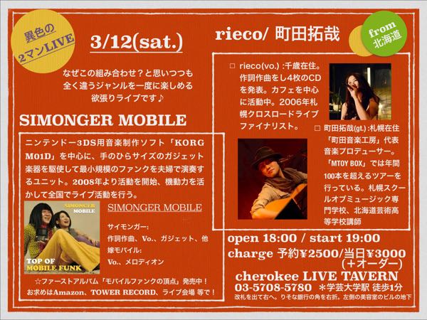 いよいよ! 真逆な2組のライブです〜 私も楽しみです〜 日時 2016年3月12日(土) 18:00open 19:00start 料金 予約2500円 当日3000円 場所 Cherokee LIVE TAVERN 住所 東京都目黒区鷹番2-19-17 城南鷹番ビルB-1 TEL 03-5708-5780 http://cherokee-live-tavern.jimdo.com/