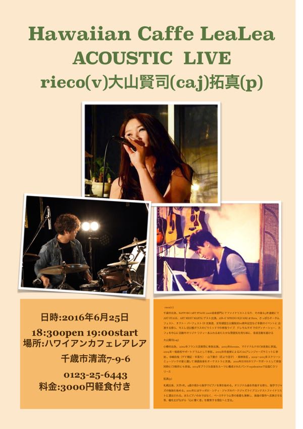 大学生になった拓真と全信頼を置ける大山賢司さんと私の大好きなカフェ、千歳のレアレアで久しぶりにライブをします! 拓真が9歳から一緒に音楽活動をし2人で曲を作ってきました。 中学生?高校生?でシティジャズファイナリストになった拓真。(いや〜ん置いてかないで〜っ!笑。いやいやどんどん羽ばたいて〜) 6月25日は2人で作った曲を中心にお届けします!ぜひぜひーっ rieco(v) 大山賢司(caj) 拓真(p) 日時:2016年6月25日18:30open 19:00start 場所:ハワイアンカフェレアレア 千歳市清流7-9-6 0123-25-6443 料金:3000円軽食付き