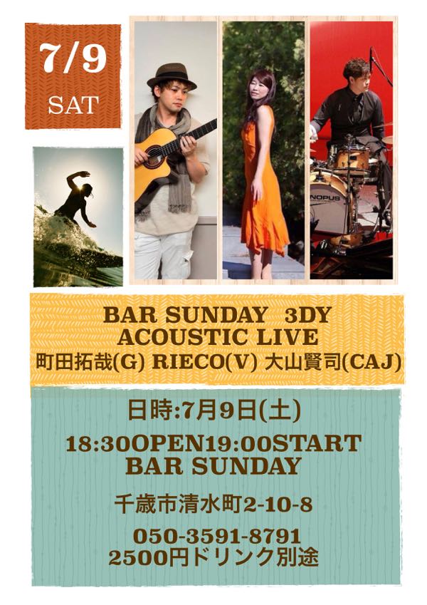 次は7月9日マッチーと賢さんとですよ! 大人の色に染めちゃいますわよぉー rieco(v) 町田拓哉(g)大山賢司(caj) 日時:2016年7月9日18:30open 19:00start 場所:BAR SUNDAY 千歳市清水町2-10-8 050-3591-8791 料金:2500円ドリンク別途