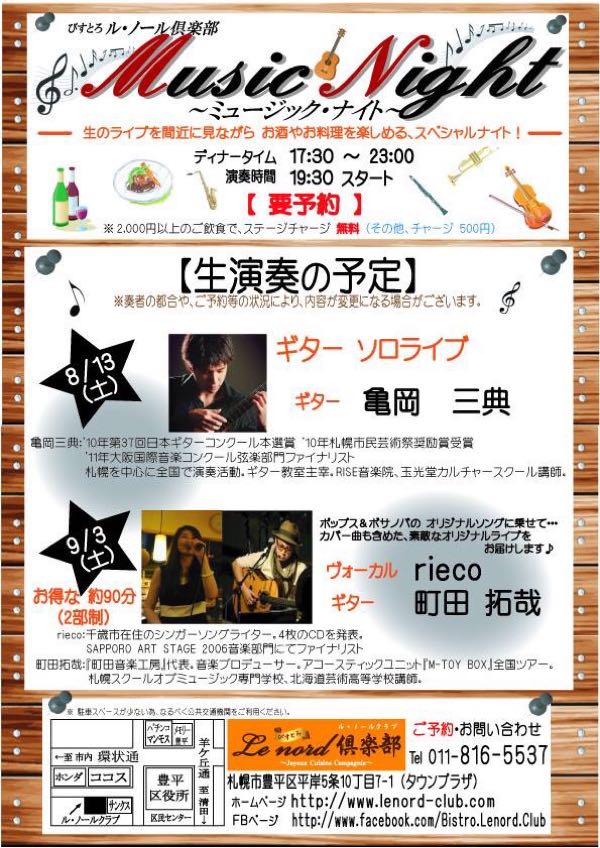 日時 9月3日 19:30スタート 場所 ル .ノールクラブ 札幌市豊平区平岸5条10丁目7-1 011-816-5537