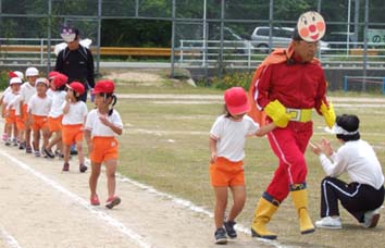 今日は運動会でした。天気予報では曇り雨だったので心配しましたが、、、みんなの想いが通じたのか?曇り晴れで暑くもなく寒くもなく、ちょうどよい天気でした(^^)ろう学校の運動会では、幼稚部から高等部までの子供全員が参加します。全校児童・生徒40人くらいでしょうかね~。。。たぶん先生のほうが人数が多いです(^^;ペコは赤組で、かけっこ、リレー、おどり(キンダーポルカ・さんさんたいそう)、あんぱんまんはきみだ(借り物競争みたいな競技)を頑張りました。かけっこは4人中3位でしたよ。ちゃんと両足が宙に浮いて走ってました。リレーも、ちゃんとバトンを渡すことができたし、おどりの振りも全部覚えて、楽しく踊ることができました。あんぱんまんはきみだ、は、袋が並んでいるところまで走って行き、好きな袋を取って、その先に立っている教頭先生(赤組)に袋の中身を渡します。中には、アンパンマンに変身するためのグッズが入っています(^^)ペコが選んだ袋の中には、黄色い長靴が一足入ってましたよ~。白組は主事先生で、バイキンマンに変身でした。先生方よく似合っていらっしゃって、、、ついつい笑ってしまいました~(^^)親が参加する競技もたくさんありました。私は、リレーと綱引きと玉入れに参加して、筋肉痛になるかな?と思いましたが、そんなこともなく、、、(いや、あさってくらいに痛くなるかも?)仕事に行くにも差し支えなさそうです。でも、やっぱり疲れました~。。。