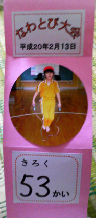 ろう学校で、毎年恒例のなわとび大会がありました。私は仕事があるので見ることはできなかったんですけど、頑張ってたみたいですペコは、バランスが悪いので、続けて飛ぶなんて事は全くできません・・・。なわを回して、足の前に来たら、それをよーく見てから飛び越えます。飛び越えたらオットット、となるので、体制を立て直してまたなわを回して、の繰り返しです。5分間で、どれだけ飛べたかと言うと・・・・、53回!去年は確か、27回くらいだったと思うので、そう思うと進歩ですね~!よく頑張りました~