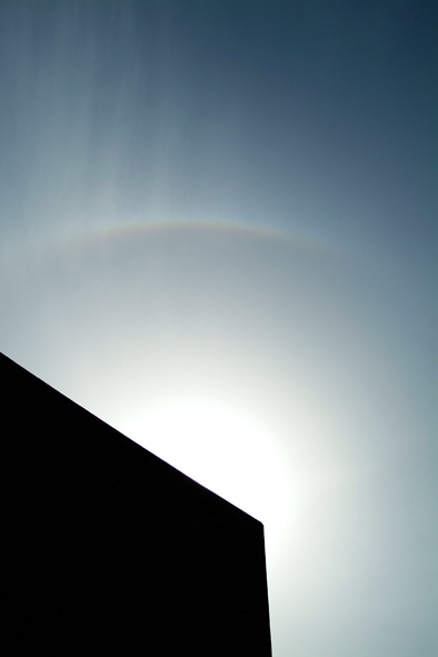 仕事が終わって、小学校の中にある学童へペコをお迎えに行き、校内の帰り道で、ペコが植えたアサガオはどうなったの~?と言いながら一緒に観察していた時のこと。そばにある池で遊んでいた男の子が、「ペコちゃん、虹が出てるよ!」と教えてくれたんです。「えっ?こんなにお天気なのに?ペコたん、虹が出てるんだって~。」と言いながら、太陽に背を向けて探すけど、虹はどこにも見当たらない・・・。「ないよ~?」と私が男の子に聞くと、その子は太陽を指差しました。私は太陽を見てビックリ!太陽の真上に変につぶした感じの虹が出てる!!こんな変な形の虹、見たことがない~!しかも太陽の真上に出ているなんてこれは是非ともカメラに収めなければ~!!・・デジカメデジカメ、、、ない携帯のカメラ~!・・・電池切れ早く家に帰ってデジカメを~~~!!!・・・しかし帰宅後空を見たら跡形もなく・・・一体あれは何だったんだろう?生まれて初めて見ました・・・。皆さんはそういう不思議な虹を見たことがありますか?私が見た虹ととても近い写真を見つけたので、ちょいとお借りして載せますと、、、こんなんです。この写真よりも、もうちょっと虹の幅が広くてハッキリしてました。何かいいことがある前ぶれ、、だといいなぁ~