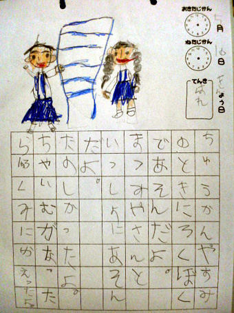 もーね、毎日大変なんです・・・思わず愚痴っちゃいますが・・・。すみませんペコの小学校生活も1ヶ月過ぎましたが、いまだに担任の先生はFMマイクを使ってくださらないし、家に帰って復習しているときに、ペコの授業内容の理解力が3割以下なのに毎日イライラ&うんざりして、、、もう、学校での理解が3割なら、家で残りの7割をやらなくちゃ、このままだとマズイ・・・と危機感をつのらせていました結果、家での学習時間が激増。宿題30分(学童でやらなかった場合)、復習1時間、予習30分で、最低でも2時間勉強しています。本当は聾学校でやっていた絵日記を続けたかったのに、そんな時間なんて全く取れず、、今、ペコの日本語力は確実に下がっていっています。助詞がめちゃくちゃになり、発音も不明瞭になってきました。一体どうしたらいいんだろう・・・何のために普通小学校に入れたのか、分からなくなってきました。この状態で、絵日記の再開や発音指導を家でやろうとすると、ペコの睡眠時間が短くなってしまいます。絵日記に1時間、発音指導に30分プラスしたら、家での学習時間は3時間半。この時間分の学習を毎日どうやって補うか、どうやって日本語の力や発音をキープさせるか、どうやって授業内容を理解させるか・・・何かいい知恵をお持ちの方、アドバイスをください。。。私はもう、いっぱいいっぱいですこれは、今日の夜にやった予習の様子です。明日の算数は「なんばんめ」というのをやるので、絵を描いて教えました。このほか、国語は「あいうえお」と「ひらがなの練習」なので先生の声が聞こえなくても大丈夫そうですが、生活は「学校探検で見つけたことについて話す」という、前もって教えておかないと答えられない授業内容だったりするので、これも予習しました。・・・これから授業内容が複雑になっていくと対処できなくなるな~と思うと焦ります。誰か助けて~