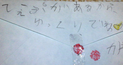 「明日は敬老の日だから、大きいばあばにお手紙を書くよ~!」・・・といきなり言い出したペコさん。敬老の日って知ってたんだちょっとビックリ。。家に帰ってから、部屋にこもってせっせと書いてました。すでに封がしてあって、中身が見れない・・・。一体何て書いたんだろう?「テープがあるからゆっくりでね」だって開ける時、破らないように気をつけてねってことか。。封筒の表はこちら。。ペコも女の子チックな絵を描くようになったのねぇ。。。1年前の絵と比べると、絵の中にストーリー性があります。明日は、(とは言っても時間的に今日か。)じいじと一緒に老人ホームへ行く予定です。一緒に行きたいけど、たぶんペコは、「ママはお留守番!」って言うんだろうな~。ペコは、大きいばあばには手紙を書くと言いましたが、じいじとばあばにはお花をあげたいって言って、自分の財布の中をチェックしていました。おっ!自分で買うつもりっぽいチラッとみたところ、、600円くらいしか入ってないな~。。ギリギリかもね。。ま、付き合うとしますか---------------------------------------------------------------おまけのペコの絵最近ペコが描いた絵です。微妙な感じだけど年齢相応の絵かなぁ~。。。 . うさぎ ママ