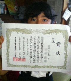 今日から新学期のペコ。集団登校で同じ班の子供達、全員テンション全く、挨拶もしやしないペコはいつもと同じく、ニコニコ挨拶で朝からテンション常にエキセントリックいえ、普通に静かに並んで学校へ行ってるんですけどね周りの子達とは気分の持ち様が違うらしい。。そんなペコが新学期早々、素晴らしいものをいただきましたそれは、、、表彰状まさか、絵で入選するなんて、、最初、何かの間違いでしょ~、もしくはクラス全員もらったんでしょ~?と思って聞いてみるとそうではないらしい。。ペコのクラスでは、ペコと、もう一人の2人だけが受賞したそうだ。。・・・信じられないんですけど・・・あんなに絵がヘタッピだったペコさんが・・・どんな絵を描いたんだろう?見てないし、聞いてない早く見たいっ!何か光るものでもあったんだろうか・・・?ペコは基本不器用なので、絵は上手じゃないんですよ。指先の力が弱いですし、おそらく脳のダメージの影響で手首や指先の滑らかな動きが難しいので・・・。あぁ、、、すっごく気になる・・・。でも・・・、もしペコが美大に行きたいって言ったら即OKしてあげようっと(気が早すぎ?)