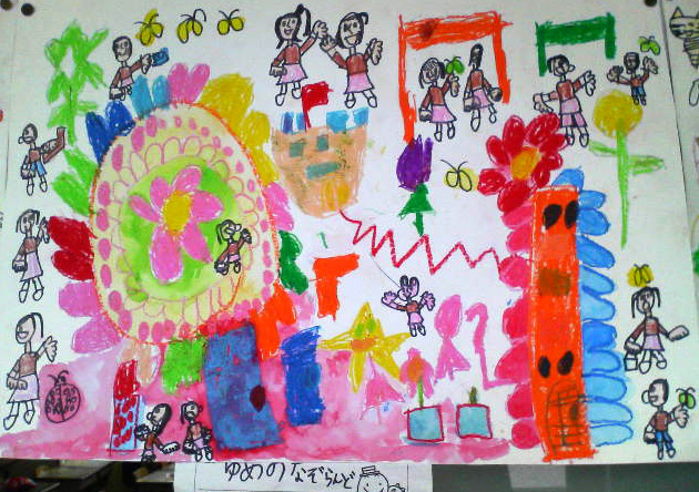 今日は学校で、2年生になって初めての参観日がありました。国語の授業、ペコは積極的に手を挙げて発表していましたよペコが先生にあてられたのは、「『たけのこ ぐん』という詩で、『ぐん』っていうのは一体何でしょう?」という質問で、ペコは、「たけのこが高く伸びる音!」と発表していました。すごい!もっともな答えを言ってる!トンチンカンな答えじゃなかった~と思って胸を撫で下ろしました~ずいぶん成長したし、頑張ってるんだねぇ・・・こちらは廊下に飾ってあったペコの絵タイトル「ゆめのなぞらんど」一体どんなランドなんだ??何だかファンタスティックです