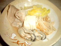 今日は雨が降って気温が余り上がらず、夕方からいい具合に冷え込んできた。昨日書いたとおり白菜が1/8玉余っているから今夜は鍋だな。しかし、あまり張り切って材料を買い込むと、またしても鍋スパイラルに落ち込むので、何か一発で終わるような鍋にしようと思ってスーパーで探したら牡蠣があった。よし、これだ! というわけで買ってきた。土手鍋にしようかとも考えたけれど面倒くさいので、普通に寄せ鍋風スープを作ってみた。牡蠣だけでは寂しいので、冷蔵庫にあった豚バラスライス(意外と厚め)も入れる。牡蠣・豚バラ・白菜の他には、エノキ・豆腐とマロニーのみ。この食材と味付けなら薬味はもみじおろしだよな。チューブだけど。今夜の〆は雑炊ではなく昨日の予告通り、これ。