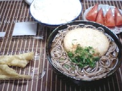 なんか数日前からそばを食いたかったんだよね。そういうわけで、スーパーで生麺のそばを探したけれど、見事に売り切れていた。ああ、みんなやっぱりそばが食いたいんだ・・・ (理由はない)仕方ないから乾麺のそばを、去年貰った乾麺のそばが美味しかったので、「乾麺と言ってもなめちゃあいかんなぁ・・・」と思いながら買ってきた。丸天(さつま揚げ)を浮かべて食おうと思ったんだけど、スーパーに筍の天ぷらの惣菜があったので、この時期に筍の天ぷら?ということで買ってきた。ご飯とトマトは昨日の残り。俺は勝手にモウソウチクの天ぷらだと思って買ってきたんだけど、帰ってよく見たらハチクの天ぷらだった。まあ、いずれにしても今年物じゃねぇよな。筍の天ぷらも浮かべて食うよ。乾麺のそばもたいして美味くないし、今夜は飯を食っただけだな・・・
