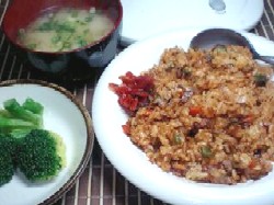 あまり寝ずに宮崎まで行き、雨に打たれながら雪代の流れ込む渓流で釣りをしたものだから、さすがに疲れた。ご飯は昨日炊いたものが残っているので晩飯は適当に家にあるもので作ろう。前日炊いたご飯をそのまま食いたくないので、焼き飯かな?親子丼かな?と考えたが、こま切れの鶏肉があるからチキンライスにしよう。鶏肉・ニンニク・タマネギ・ニンジン・ピーマンで作る。ところどころ白いところがあるように見えるのは皆さんの目の錯覚だから。いつも、中華スープが付けば炒飯だし味噌汁が付けば焼き飯だって力説しているけれど、チキンライスはスープが付こうと味噌汁が付こうとチキンライスだ。ちなみに、昼に食った阿蘇なのに本格台湾ラーメン。タイトルに深い意味はない。釣りの話はまた明日。