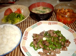 昨日のツナサラダと味噌汁が残っているので、何か簡単に出来るものにしよう。焼肉用の豚肉を買って来てフライパンで炒めてみた。ピーマンも付け合せてみる。それだけではちょっとインパクトが足りなかったので、豆板醤を絡めてみた。まだちょっとインパクトが不足しているので、さらに出来上がって豆板醤を振ってみる。ところで、誰も気づいちゃいないだろうけれど、俺のデジカメはまたしてもヨーロッパ旅行中なので、ここのところ携帯画像になっている。俺はアジアから一歩も外に出たことがないのに・・・