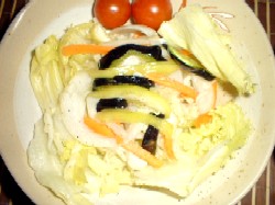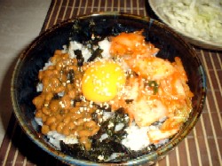 去年赤い人に会った時に直伝されたレシピだ。えっと、納豆キムチ卵かけ丼ってところかな 今回はもみ海苔を敷いてゴマをふってみた。カレー(カレイ)がもう1枚残っていたのを冷凍していたので、今夜はこれを焼く。サラダはキャベツとプチトマト・キュウリ。ちなみに赤い人のブログはここだけど、心臓の弱い人や、人生を穏やかに過ごしたい人にはちょっと・・・