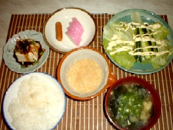 やっと北部九州も梅雨入りしたらしい。今日は1日中雨だった。きっと畑の作物も潤っていることだろう。今日は帰ってくるのは早かったんだけれど、帰ってきて少し仕事をしたので、晩飯は冷蔵庫に入っているもので適当に作る。まずは少し残っていた長芋をとろろにした。これさえあれば他はなんにもいらないんだけどね。豆腐も消費期限を過ぎていたから、半分はわかめと味噌汁に、半分は冷奴にする。かまぼこ半分と、なぜか1本だけ残っていたお弁当サイズの小さなウィンナー付き。サラダはレタスとキュウリだけ。次トマトが登場するのは多分週末だな。