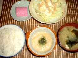 昨日の予告通り今夜はとろろご飯にした。とろろご飯の日はとろろがメインのおかずなので、そのほかは地味目になる。ワカメと麩の味噌汁、豆腐とレタスのサラダ、カマボコ半分。別にダイエットしようとは思っていないから。そんなことより、キタ━━━━━━(゜∀゜)━━━━━━!!!!