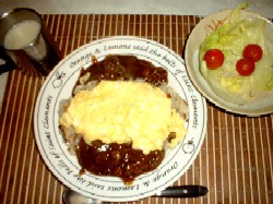 昨日の残りの この日のために作ったハッシュドビーフがある。半分は昨日の内に冷凍したので、取りあえずは今夜食えば終了だ。昨日と一緒じゃ面白くないので、ニンニク・ニンジン・マッシュルームと塩コショウのみでガーリックライスを炒めて、上にとろとろオムレツを乗せてみた。(今日は卵1個と牛乳なので開かない) う~ん、なんか自画自賛したくなるような晩飯だ。ついでに、今日コンビニで見つけた 喫茶 名古屋カフェオレ。名古屋って言うからには、コーヒー買ったら小倉トーストくらいサービスしてくれなきゃ・・・