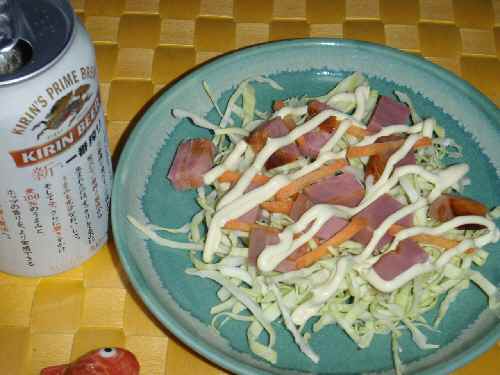 今週末はもう3月なんだよね。俺の春のマラソン大会シーズンも先週で終わったことだし、今日からお盆過ぎまでは、走る量を週に6km×3回にする。さすがに暖かくなって来て、冬は10km走っても汗も掻かず、体重も落ちなかったが、走ると体重がガツンと落ちてくれるのでうれしい。そして、ランニング後のビールが美味い。そんな今夜は、角切り叉焼をアテにビールから飲む。わざわざUPするほどでもないが、今夜は生野菜(と言ってもキャベツとニンジンだけだが)をここで食ったもので。(久しぶりに平日に6kmを走ったからだろう、飲酒後こ意識不明に陥り、2時間経過。)おかずには、豚汁に使った豚のこま切れとコンニャクが半分余っていたので、ダブついていたニンジン(サラダのニンジンはここから流用)も加えて炒めて、塩コショウとしょう油でスパイシーに味付けて、ゴマを振った。麩の味噌汁を作る。昨夜は、警察24時が20時から22時半という中途半端な時間だったので、番組が始まる時間にはすでに酒を呑んで出来上がっていたし、晩飯は一昨日作った豚汁がメインだったので、別に書くこともなかった。ついでにどうでもいい話だが、晩飯はコンブタだが、紺ブレはダブルに限るだろういや、夏場はシングルの方が身軽だけれど・・・