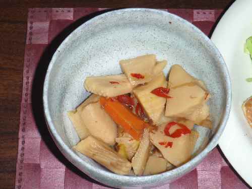 日曜に掘ったたけのこがあるので、前回の鶏肉との煮込みとは180度方向を替え、冷凍していたアグー豚のしゃぶしゃぶカットと、白だし・料理酒に、豚肉だから生姜(単にダブついていたから)・俺の鷹のツメで煮込む。今日は雨だったが、走らないと後がきついので、6kmを走ってビールから始める。アテにはもう一品、実家からもらってきた、鶏肉と砂ずりのスパイシーなやつ。晩飯は、一昨日作ったたけのこご飯の3日目(最終日)だし、汁物はさっき明日の分まで作ったたけのこの吸い物、おかずは引き続きアグー豚とたけのこ。って、どんだけ「たけのこな話」やねんって感じ。それでもたけのこはまだ残っているが、穂先がまだ残っていると思っていたが、さっき水を替えるために確認したら、残りは根っこばっかりだった。