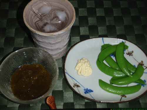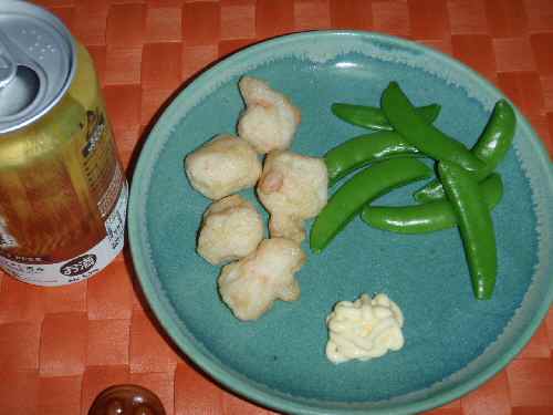今日はやっと今週2回目を走って、昨日買った、エビがゴロっと入った天ぷら(さつま揚げ)を半分残していたので、さっき畑からパクって来て、一茹でしたスナップえんどうと共に酒のアテにする。後輩から1kgを付き合わされたアグー豚のしゃぶしゃぶカットの、まずは500gパックを開封した残りの、(多分)120gくらいがあるので、昨夜から、しょう油・料理酒・水に摩り下ろし生姜で作った液に漬けていた。このうちの半分を焼いて、キャベツとプチトマトにスナップえんどうも付け合わせる。味噌汁の具もなかったので、一茹でしたスナップえんどうの一部を使う。スナップえんどうと色がかぶるけれど、ネギもダブついているので投入。昨日一腹を切った辛子明太子もまだある。薄っいけど美味いよ、アグー豚だもん。液に漬かった豚肉が半分残っているので、明日はどんな画期的なメニューになるのか いや、選択肢はないだろう・・・