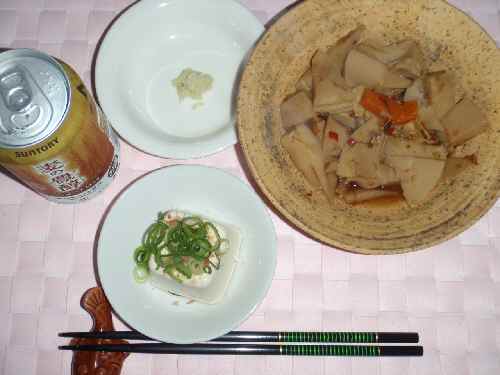 日曜日に大会で走ったから、Myルール的には今週は2回しか走らなくていいのだが、なんとなく仕事にも体力にも余力があったので、気がつけば今日から始動する。そういうわけで今夜は、昨日作ったタケノコの煮物と小さな充填豆腐の冷奴をアテに、ビールから始める。昨日はネギも鰹節も在庫がなかったのだが、今日は買ってきた。生姜がダブついているので、薬味には生姜を下ろす。昨日隣りの畑からパクったスナップえんどうがあるので、ウィンナーと一緒に炒めて、塩コショウを打つ。若いスナップえんどうは、一茹でしてマヨネーズでいきたいが、ここまで育つと、炒めて塩コショウでスパイシーに仕上げると、豆の甘味が増すような気がする。酒のアテで余ったタケノコの煮物と、一切れだけ残っていた辛子明太子もおかずになる。汁物の用意も一応したのだが、そこまでは必要なさそうで汁物レス。