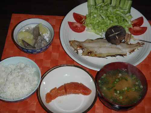 先日焼いたヒレグロ(カレイ)の干物は4枚入りで買って来て、残りの3枚は冷凍していたが、そのうちの1枚を解凍して焼こう。しいたけ1枚も一緒に焼いて、春キャベツとキュウリにトマトもプレートに飾る。夕方実家に帰省している妹から、鶏肉とじゃがいもにゴボウの白味噌煮をもらったので、これもおかずになって、豆腐の味噌汁を作る。3月中に辛子明太(切子)を買って冷凍していたので、その一部も解凍した。辛子明太子だけで、今日炊いた1.5合のご飯を全部食べられそうな気はするが、そこはほら、俺にも事情があるから3等分して、0.5合を今夜食う。