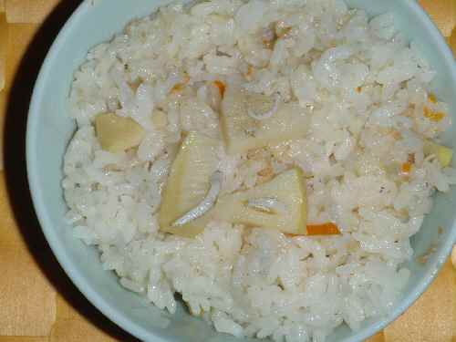 週末ごとに天候が悪いせいで、今年はまだたけのこ掘りに行けていないのだが、数日前にもらったたけのこがもう少し残っているというか、たけのこご飯のために、昨日一昨日と水を入れ替えながら残していた。そういうわけで、今夜はたけのこご飯を炊こう。具にはシラス干しを買って来て、ニンジンの細切りも入れる。ぶなしめじも買ってきたが、イメージが違って使わず。味付けは、1.5合の米と定量の水に、料理白だし20ccと塩のみ。たけのこが少し余るので、昨日のスナップ&ウィンナーとはコンセプトを代えて、たけのこ&ウィンナーに、時々「昨日の残りの」スナップえんどう。トマトにキャベツの千切りとニンジンの細切りサラダに、一把だけのそうめん。