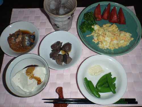 今日は本来は酒を断つべき火曜日だが、年度初めから我慢ばかりしていたら乗って行けないだろうと、呑む気満々だった。そんな今日は夕方実家に寄って、妹からおかずをもらい、酒のアテだらけになる。日曜日のドライブの途中に買った寄せ豆腐(日月と酒のアテにして今日で終わる)に、畑に行ったら収穫可能だった、隣の畑に植わっている初物のスナップエンドウ、サバの味噌煮缶と鶏レバーの生姜煮に、昨日書いたように緊急で作った茹で卵を使い、タマネギのみじん切り・ニンジンの千切りでマヨネーズサラダを作る。結局、寄せ豆腐・スナップエンドウで酒を呑んで、鶏レバーの生姜煮とサバ缶に、茹で卵で作ったサラダ、これまではにゅう麺だったが、暖かくなってきたので一把だけ茹でた素麺で晩飯を食う。