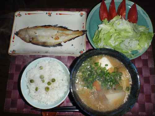 春になって店頭にグリーンピースが並んでいるのを見かけると、年に一回くらいはグリーンピースの炊き込みご飯を作りたくなる。年に一回くらいはと書いたものの、今夜使ったのは買って来た半分なので、グリーンピースの大量消費方法を思いつかない限り、また作ることになるかも。里芋が2個残っていたので豚汁を作ろうと、数日前に豚肉を買ったのだが、なんかずるずるとタイミングを逸していた。今夜は走らない日なので時間に余裕があるので、豚肉とタマネギ・ニンジンをごま油で炒めて、鍋に移して里芋を入れて煮る。途中で糸こんにゃくも加えて、豚汁自体はまた作りすぎてしまって、明後日くらいまで残りそうだが、最後に今日の分だけの豆腐とエノキを投入する。豆腐は初めから当日分だけを投入する予定で、小さな充填4連豆腐を買ってきたので、切らずに一丁というか1パックをそのまま使う。レタスとトマトのサラダに、昨日妹から貰ったかぼちゃとシーチキンの煮物。今夜は酒を飲まない日なので、もう一品分くらいのカロリーは必要かと、もう一つ食材を買って来たのだが、そこまではいらないかと作らなかった。