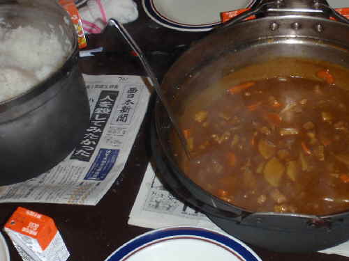 40年以上同じ体でキャンプを繰り返してきているから、海か山かの違いがある程度で、やることはわかりきっていて、例年暇を見つけては、1~2回は記事を書く余裕があるのだが、台風は北部九州を直撃しなかったとはいえ、強風雨の中のキャンプで、いつも以上に子供達から目を切ることが出来なかった。さらには予定の野外活動をこなせず、師匠がなんの前触れもなく突然言い出す、「次はこんなことをするから」との無茶ぶりを、何とか形にするべく右往左往した。まあ、荒天の(小学生団体の)キャンプなんて何が出来るというわけではないが、テント設営と野外炊飯(炊爨)だけは出来ないと、衣食住の食住が欠ける。そういうわけで、三度三度の食事だけは何とか子供が作ったのだが、この団体のキャンプの初日は、俺が小学生の時から変わることなく、カレーと決まっている。(鍋の下敷きの新聞タイトルが世相を表している。)そして昼食でやったそうめん流しの写真なんだけれど、汁が入った竹筒の器を、一生懸命抱えた姿が可愛らしくて撮った写真。(この竹筒を用意したのは俺ではなく、事前に作ってくれた方がいらっしゃる。)そして、2日目の晩飯は、メニューとしては野菜炒めらしいんだけど、俺は食器洗うのが面倒なので、キャンプの時はたいがいワンプレート。