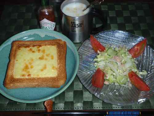 今日は昼飯を食い過ぎて(と言ってもうどんとかしわご飯茶碗一杯だけれど)、昨日炊いた冷蔵ご飯も残っているが、どうもハードな晩飯が食えそうにない。ところで、毎週月曜に6枚切り食パンの封を切って、一枚ずつ食べるのが標準だが、今週は、家で朝食を食わなかった日があったので、もう一枚在庫が残っている。日曜の朝くらいカロリーを気にせずに、食いたい物(パンだけど)を食いたいから、この残り一枚の食パンは、今夜消費してしまおう。そういうわけで、とろけるチーズを乗せ、トースターでチンして、タバスコを振る。千切りキャベツとタマネギ・キュウリをスライスし、水に晒し塩揉みして、シーチキンで和えたサラダに、カップのポタージュスープ付き。