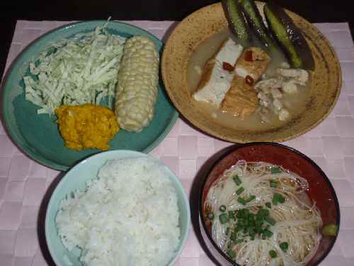 そういうわけ(前記事参照)で、昨晩(記事をエントリーする時点では一昨日かも?)キャンプから帰ってきたが、野外での活動が少なかった割には疲れていて、酒を飲んだらつぶれていた。3日ほど畑に行けないうちにピュアホワイト(トウモロコシ)は、今年は長雨で出来が悪いが、それがそれなりに収穫時期を迎えていた。3本ばかり収穫してきたので、茹でて酒のアテにする。前にも書いたことがあるが、甘いトウモロコシも、立派な酒のアテだから。一応、俺にも見栄ってものがあるから、少しでも写りがいい向きで撮っているが、実際はスカスカ。ナスも一本収穫してきたので、いつも変わり映えしないけれど、豚バラと俺の鷹のツメを入れ、料理白だしと塩・酒で煮込む。ついでに大家の畑からオクラもパクって来て、塩揉みして、トウモロコシが茹で終わる頃に、その鍋に投入して一茹でした。みそ汁もナスの一部を借りた。