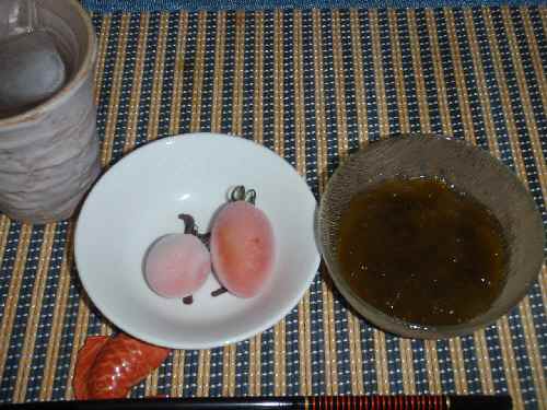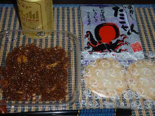 朝歩く時にはほとんど降っていなかったが、それ以降は降ったり止んだりだった。それでも走る時間には雨も上がっているから、運がいいというか、悪いというか。そんな今夜は、夕方6Kmを走ったのでビールから飲み始めるが、走り終わった後で、さて何をアテに酒を飲もうかと考えていたのだが、体が塩分を欲したのか、塩辛い物をイメージした。ちょうど先週来福したkuniさんからいただいた高級せんべいがあるので、今夜はこのうちの蛸御膳を酒のアテにしよう。封を切ると皿というか船に乗ったせんべいだが、もちろん皿も、えびせんべいなので食える。晩飯には実家から貰って来た、「平飼い」らしい卵がもう1個あるのだが、先日と同じ卵かけご飯ではつまらなし、冷蔵保存のご飯だし、丼物にしようと思うが、具が何にもなかったので、タマネギと卵だけで卵丼にした。和えサラダにするにはキャベツの量が微妙だったので、千切りキャベツとキュウリに、シーチキンとタマネギだけをマヨネーズで和えて添えたサラダ。北海道産トマトと、汁物代わりに1把だけ茹でたそうめん。
